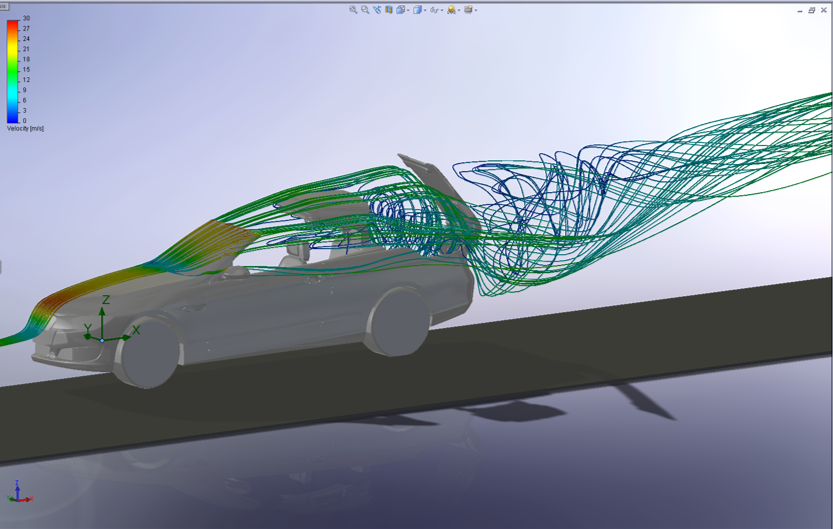Moderne Cabrio Systeme können auch während der Fahrt geöffnet und geschlossen werden, die Fluid Simulation bietet hier die Informationen über den Druck an den sich öffnenden Dachschalen. Zudem kann die Druckverteilung auf Bauteilen wie Schiebedachsystemen, Cabriodachschalen, Seitenfenstern, Heckspoilern, etc. bei hohen Fahrzeuggeschwindigkeiten ermittelt werden.