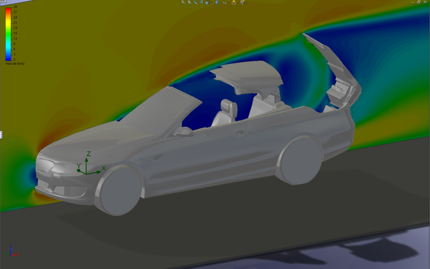Moderne Cabrio Systeme können auch während der Fahrt geöffnet und geschlossen werden, die Fluid Simulation bietet hier die Informationen über den Druck an den sich öffnenden Dachschalen. Zudem kann die Druckverteilung auf Bauteilen wie Schiebedachsystemen, Cabriodachschalen, Seitenfenstern, Heckspoilern, etc. bei hohen Fahrzeuggeschwindigkeiten ermittelt werden.